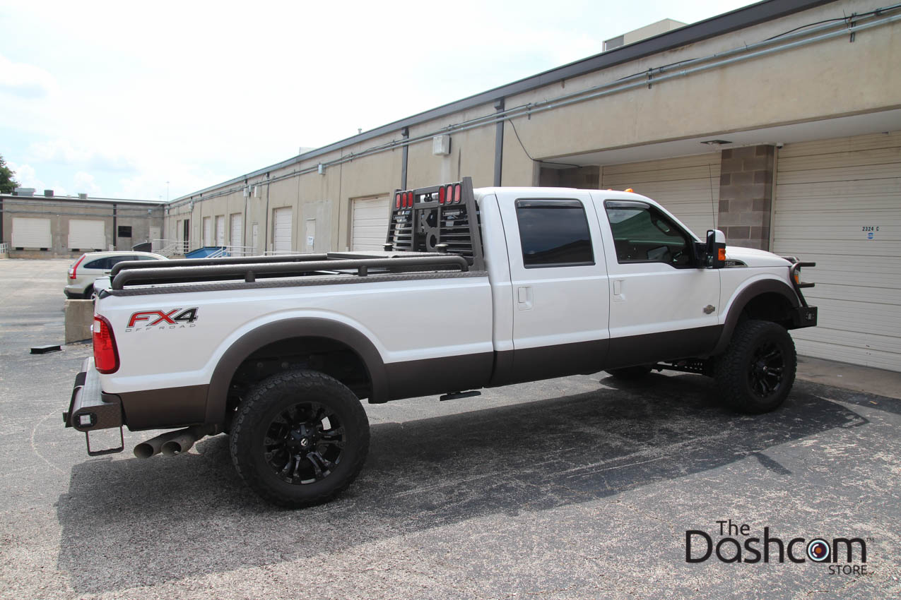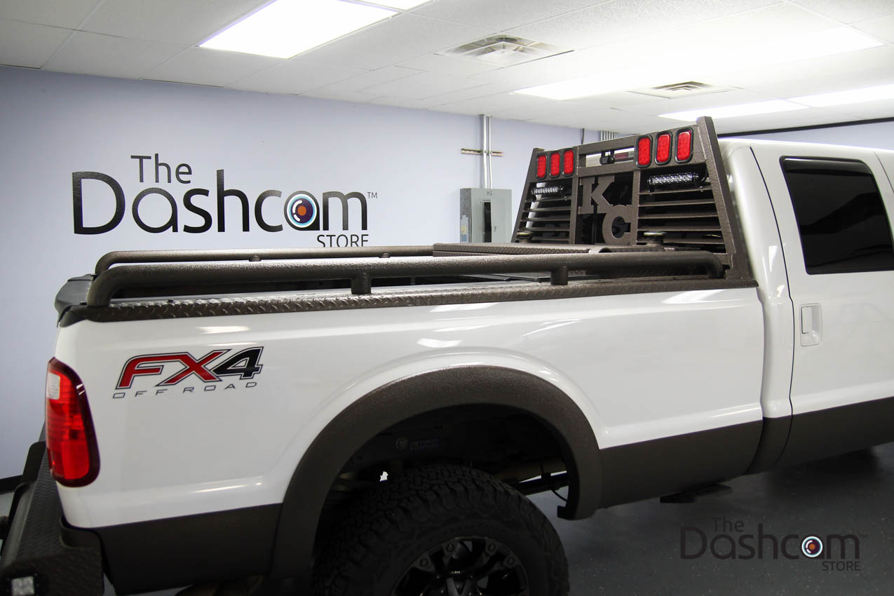 This Ford F-350 was equipped with a substantial "headache rack" (cab guard / cab protector) behind the rear window of the cab, which is why we installed the Truck version of the BlackVue DR650S-2CH / DR750S-2CH system. The DR650S-2CH-Truck / DR750S-2CH-Truck version comes with a rear-facing camera that is enclosed in a completely waterproof housing, so that the rear camera can be mounted on the outside of the vehicle (rather than inside the vehicle as with the normal DR650S-2CH / DR750S-2CH system). We mounted this external rear-facing camera in a safe location on the headache rack, you can see how it tucks in nicely in the center of the rack: