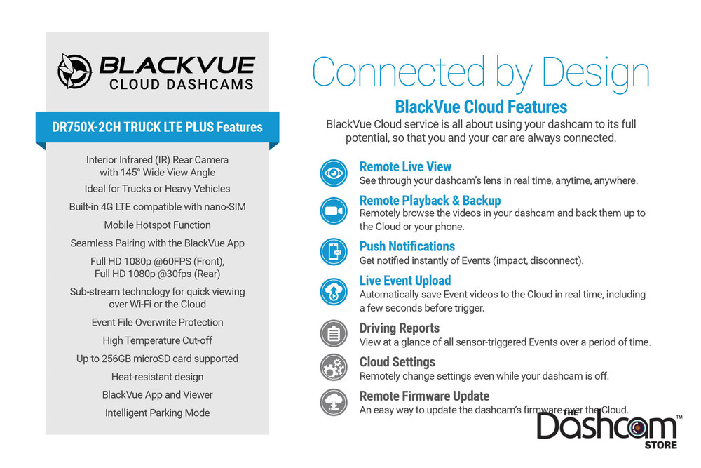 - How does the DR750X-2CH-TRUCK-LTE-PLUS compare to other BlackVue models? Please see our BlackVue Dash Cam Buyer's Guide for a detailed comparison